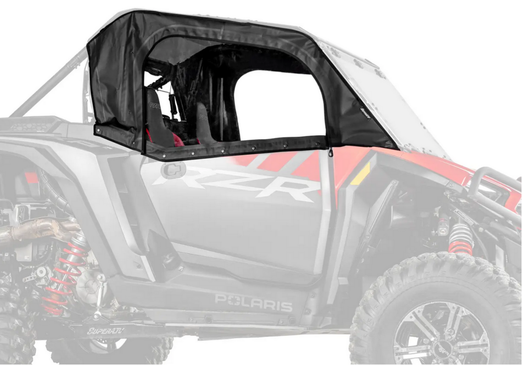Made with Pel-Tek Technology Soft doors are prone to punctures, abrasions, and mildew. Thanks to Pel-Tek technology, these doors are the exact opposite. They’re made with PVC-backed polyester that’s heavy duty and stronger than what other manufacturers use. Our premium stitching technique uses a binding that’s better than hemming for a clean, finished look. And it won’t stretch out over time thanks to precision CNC cutting. Our soft doors attach to your RZR using heavy-duty Velcro and frame-mounted snaps. And if the trail gets extra bumpy or you need to trailer your machine, cinch straps allow for extra security.
